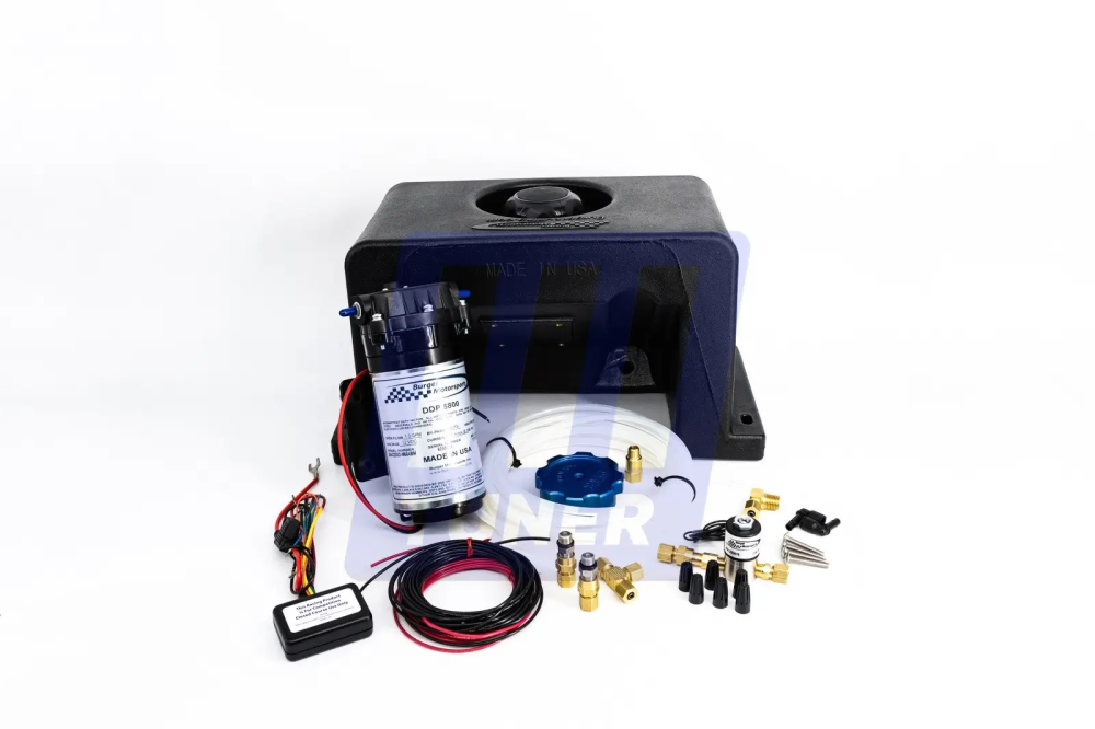 Базовый комплект системы впрыска водо-метанола Burger Motorsports для BMW B58, дополненный двумя форсунками BM7, емкостью для метанола и крышкой бака с интегрированным обратным клапаном.